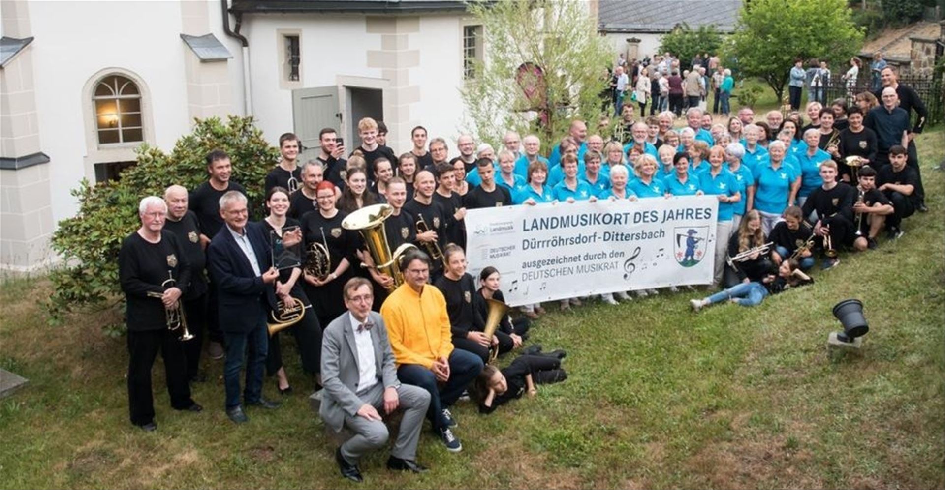Am 29. Juni war es nun soweit: Vertreter des Deutschen und des Sächsischen Musikrats hatten sich angekündigt, um unserer Gemeinde als einzige in Sachsen die Auszeichnung "Landmusikort 2021/22" zu übergeben. Gewürdigt werden sollten damit die vielfältigen musikalischen Aktivitäten in unserer Gemeinde mit Kirchenmusik, Gesangverein und nicht zuletzt Posaunenchor. Speziell wir als Posaunenchor sind dabei das verbindende Element, zeichneten auch für die Bewerbung verantwortlich. Eigentlich sollte der örtliche Rahmen das Lieblingstal des Johann Gottlob von Quandt sein, in dem wir seit nunmehr 10 Jahren immer eine Sommermusik gestalten. Jedoch hatten uns die Meteorologen einen Strich durch die Rechnung gemacht. Getreu dem Spruch "Die Meteoro-LOGEN" war Gewitter und  Starkregen angekündigt, spätesten ab 19:00, dem Beginn des Konzerts Deshalb verlegten wir die Veranstaltung kurzfristig in die Dittersbacher Kirche. Aber ... sie logen, die Meteorologen!